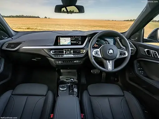 L'intérieur de la BMW 1M est sobre et sportif, avec des sièges baquets en cuir, un volant sport et un pédalier en aluminium. La voiture est équipée de tout le confort nécessaire pour les longs trajets, mais l'accent est clairement mis sur la performance et la conduite sportive.