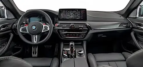 L'intérieur de la BMW M5 est luxueux et high-tech, avec des matériaux haut de gamme et des équipements dernier cri. Les sièges en cuir surpiqués sont confortables et offrent un excellent maintien, et l'habitacle est spacieux pour cinq occupants.